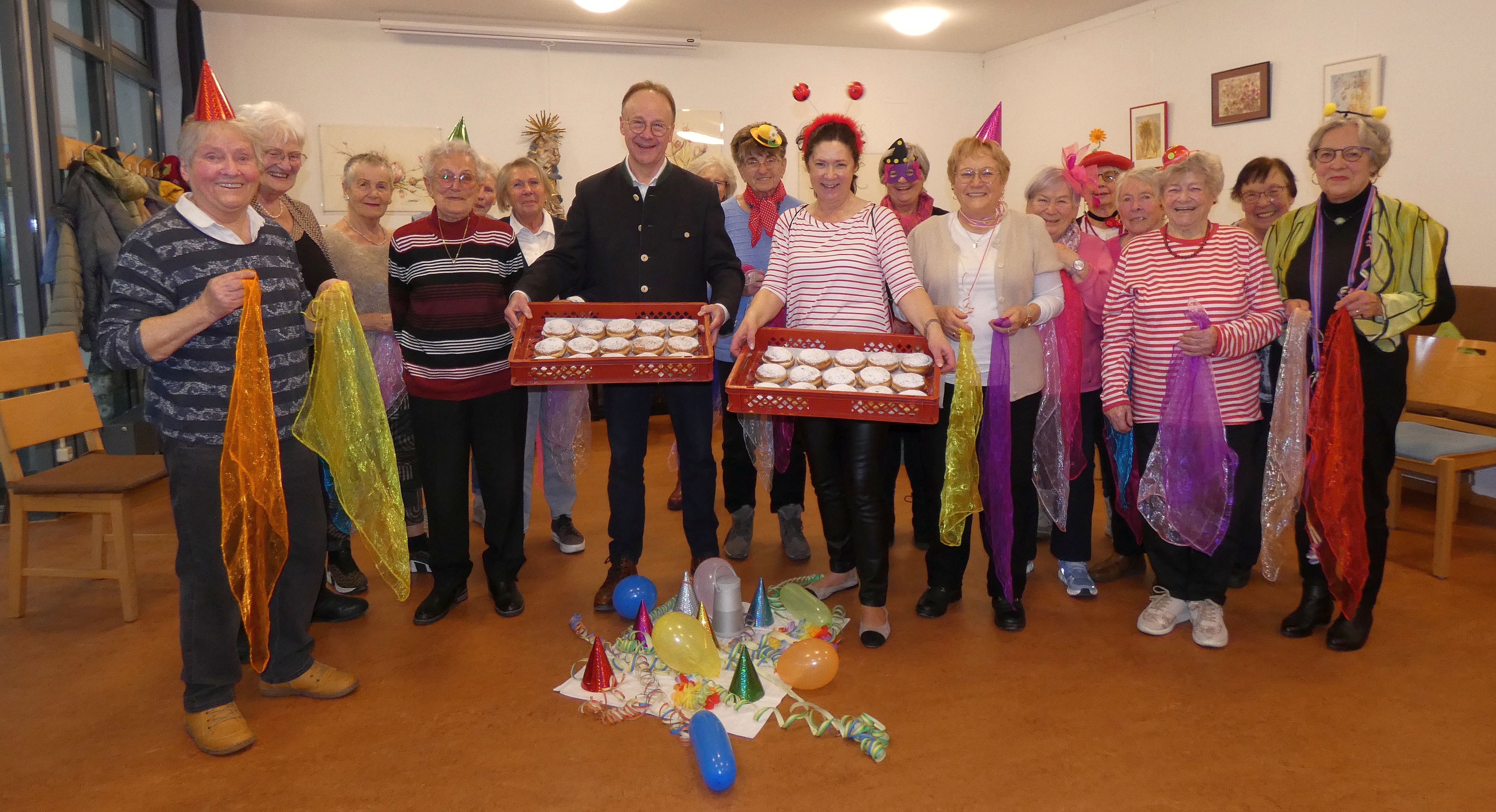 Das war eine bunte, von Anfang an ausgelassene Runde: Hüte, Mützen, Masken, Fühler und vieles mehr hatten die Besucherinnen mitgebracht. „Gute Laune und Fröhlichkeit haben wir zwar immer. Aber heute geben wir noch mehr Gas“, erklärte Andrea Brodschelm und dann legten die Damen auch schon los. Als Überraschungsgast war Stadtratsmitglied Urban Mangold in den Zwinger gekommen. „Er versorgt uns faschingsmäßig mit Krapfen“. Diese Ankündigung von Andrea Brodschelm wurde gleich mit Applaus quittiert.
