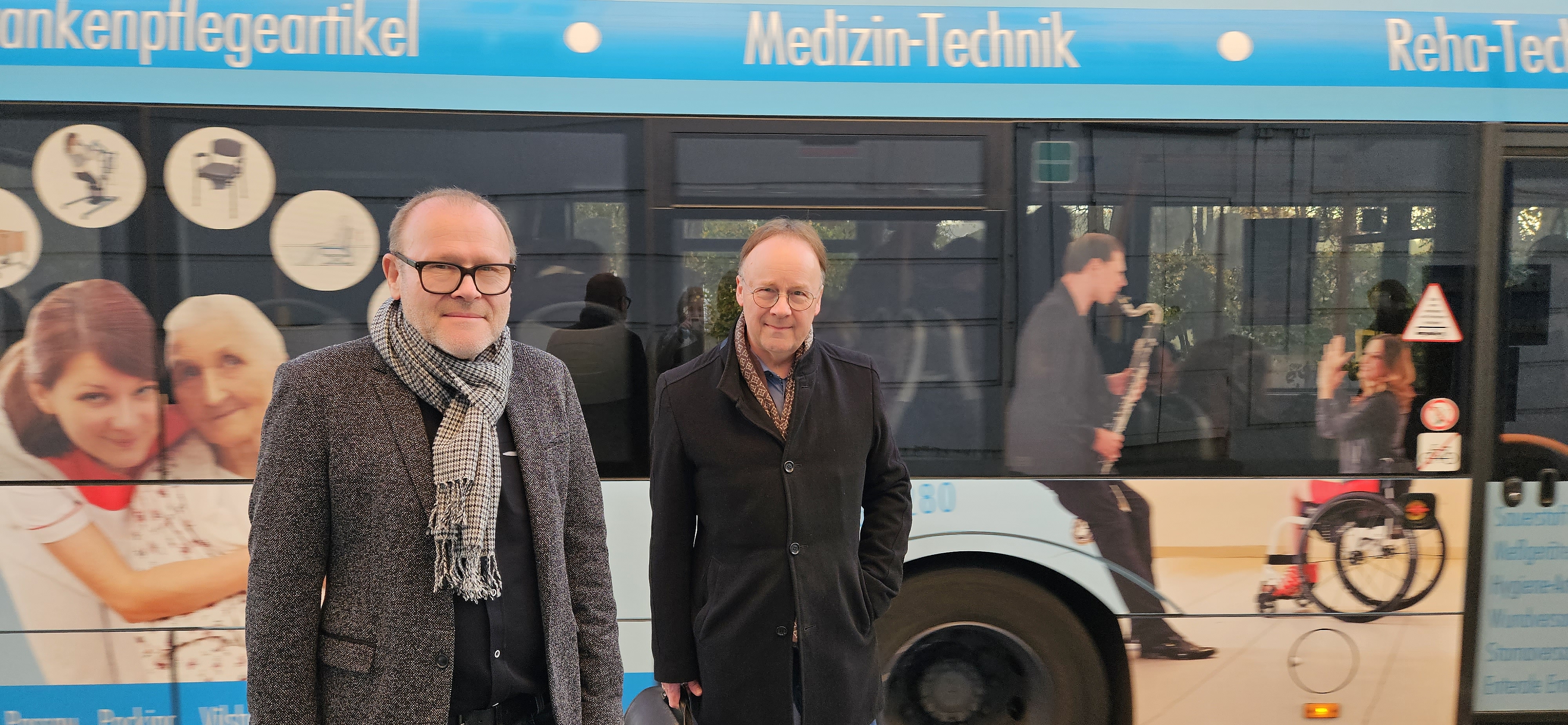 Die ÖDP-Stadträte Paul Kastner (links) und Urban Mangold (rechts) wollen die schrittweise Umrüstung auf schadstofffreie elektrische Busse unterstützen. Foto: Anna Mangold.