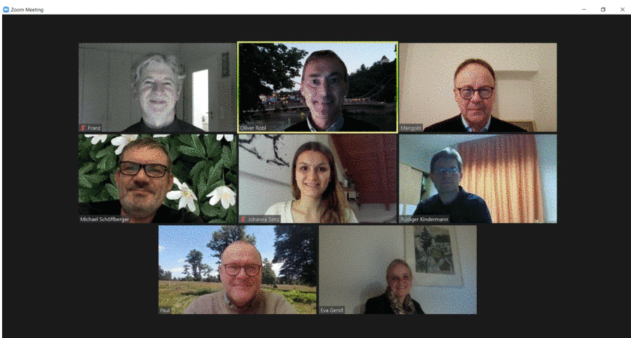 Beim Online-Fachgespräch zur Krise der Krankenpflege (von links oben nach rechts unten): Die ÖDP-Stadträte Franz Prügl, Oliver Robl, Urban Mangold und Michael Schöffberger, die stellvertretende ÖDP-Kreisvorsitzende Johanna Seitz, Verdi-Ortsvorsitzender Rüdiger Kindermann, Stadtrat Paul Kastner und Stadträtin Dr. Eva Gerstl. Screenshot: Robl.