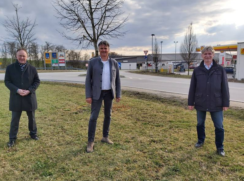 Hier in Jägeröd in der Gemeinde Salzweg könnte neben dem Gewerbegebiet das Umsteigezentrum entstehen, das Passau entlastet – für Park & Ride und als Ausgangspunkt für schnelle Radwege. Darin stimmten bei einem Ortstermin im April (von links) Stadtrat Urban Mangold, Bürgermeister Josef Putz und Stadtrat Franz Prügl überein.